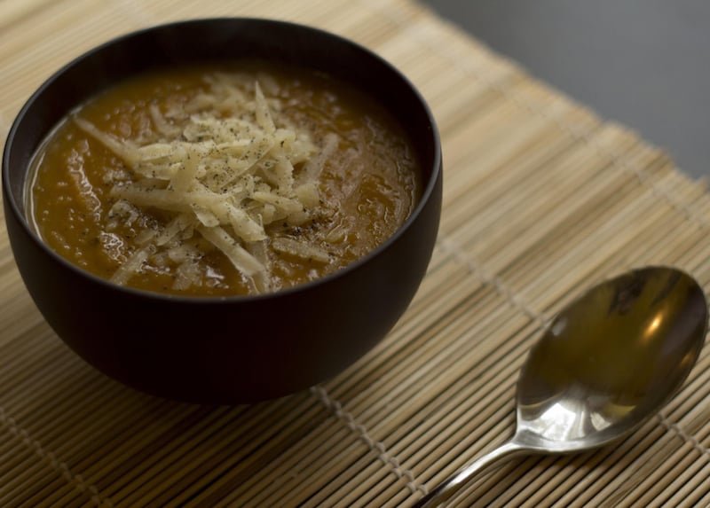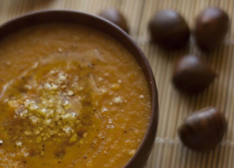 1. Peel and chop the onion. Wash and mince the fennel. Melt the butter in a pot, add the onion and fennel and cook for 5 minutes over medium heat. Add the chestnuts, salt and pepper. Pour the broth in, cover and simmer for 20 minutes.